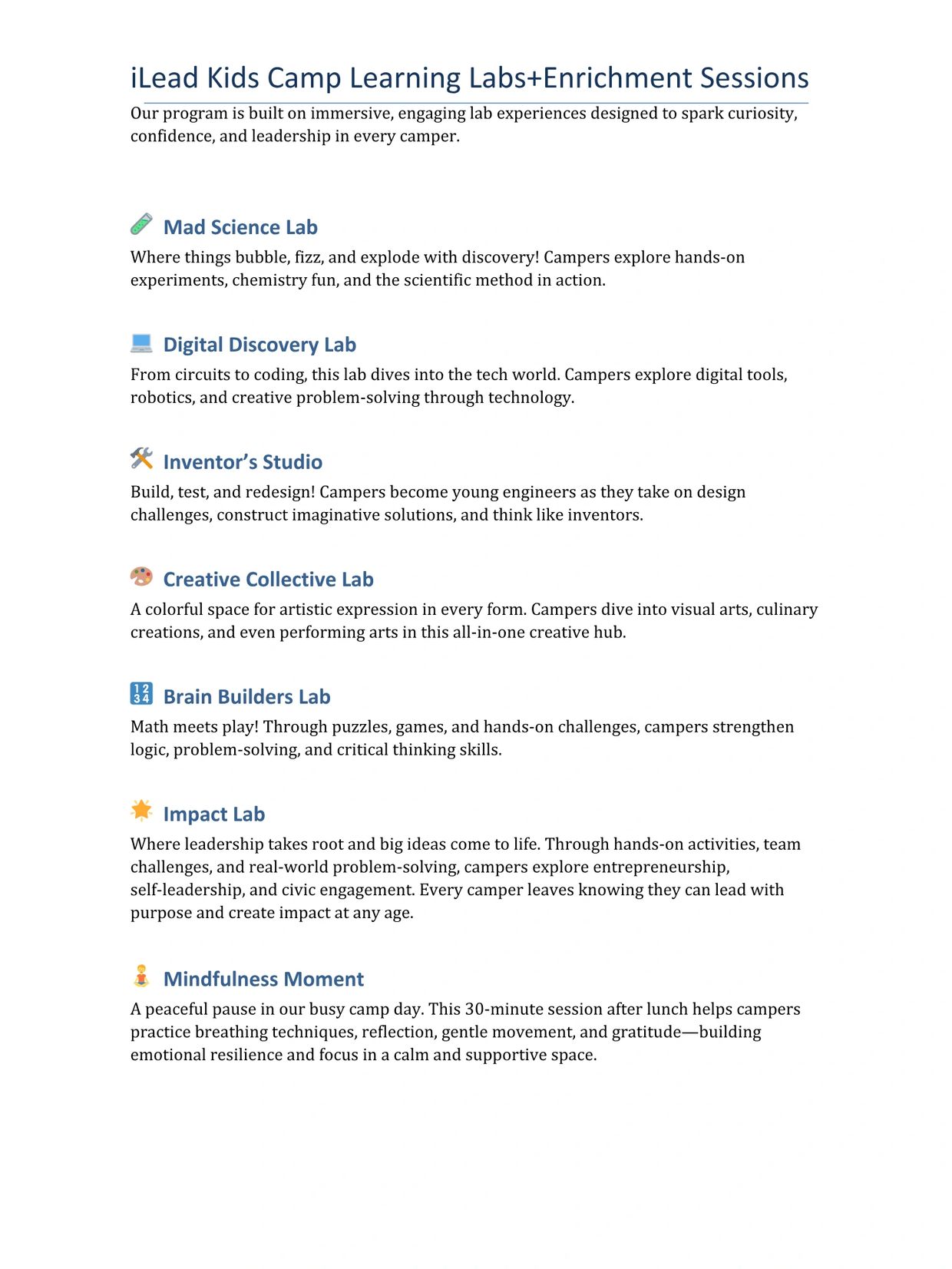 Our Learning Labs and daily enrichment sessions blend creativity, critical thinking, leadership, and mindfulness. From hands-on S.T.E.A.M. exploration to entrepreneurship, academic skill-building, and guided reflection, each experience is designed to nurture the whole child — mind, body, and spirit.
